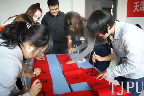 见面会分为学生对自己祖国文化的介绍、毛笔字练习和讨论交流三个环节。在对自己祖国介绍环节,各国学生分别向大家展示了自己国家的人口、面积、美食、建筑、音乐、著名人士等,让大家对彼此的国家有了更清晰的认识。随后,见面会在中外学生撰写毛笔字时达到高潮,中国学生向留学生示范了如何握笔、运笔,外国学生则一笔一划临摹汉字“友谊长存”,大家对中国汉字文化及书法文化表现得颇有兴趣,充分体验了中国文化之文房四宝与中国书法的节奏韵律美。最后,中外留学生进行了才艺表演,并开展了兴趣爱好和专业的讨论交流。