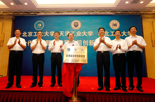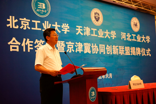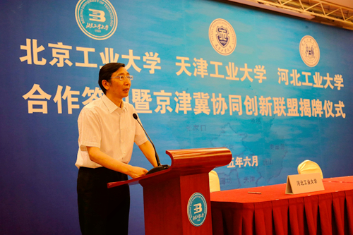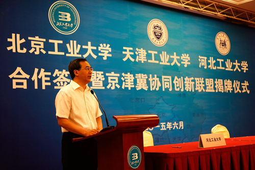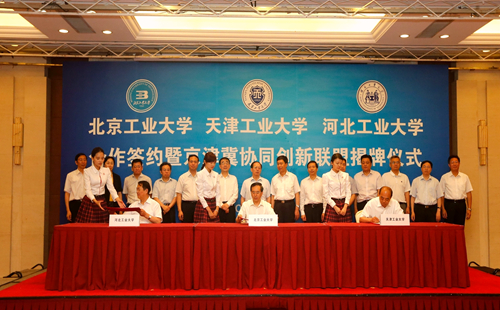 为深入贯彻京津冀协同发展的国家发展战略,提升京津冀高等教育服务区域协同创新能力,由北京工业大学、球探游戏、河北工业大学合作成立的“京津冀协同创新联盟”,6月14日上午在北京签约。北京市委常委、教工委书记苟仲文,天津市人大常委会副主任苟利军,河北省副省长许宁出席并对三所高校强强联合给予充分肯定。天津市教委副主任韩金玉,天津市科委副主任贾堤,天津市环保局副局长谢华生,我校党委书记张宏伟、校长杨庆新、副校长程博闻,以及相关学院和职能部门负责人出席仪式。