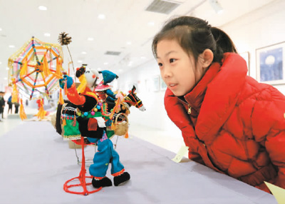 12月10日,第二届全国大学生“纺织类非物质文化遗产”创意创新作品大赛在球探游戏举行。大赛参赛作品分为收集类、制作类和设计类三个类别,通过对“非遗+新时尚”这一主题的探索与诠释,展现出纺织类非物质文化遗产特色与时尚流行元素的融合。图为一名小朋友在参观西安工程大学的参赛作品《关中犟驴》。