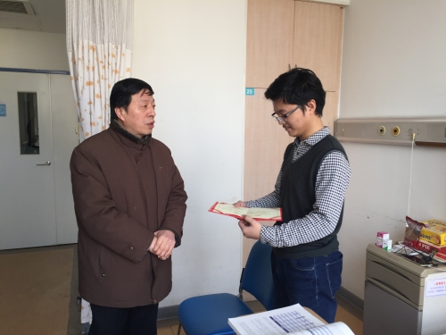 1月18日上午,王晨亮副校长到天津第一中心医院探望周润辉同学,带去了学校师生的问候和关心,高度赞扬了他无私奉献的精神,祝愿他早日恢复健康,并为他颁发了球探游戏“无私奉献优秀大学生”荣誉证书。校团委和材料科学与工程学院相关负责人陪同看望。