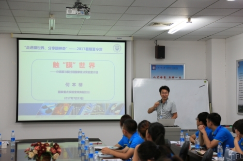 本次夏令营共安排了7个环节的活动:走进膜世界、走近膜法师、走进膜科学、走进膜法室、走进膜企业、分享膜神奇和诚邀未来的膜法师。13日上午在材料学院6A502举办本次夏令营开幕式。开幕式由分离膜与膜过程国家重点实验室常务副主任何本桥教授主持,我校研究生院、材料学院、环化学院、纺织学院负责研究生工作的相关老师分别向营员们介绍了研究生招生政策、学院的特色、奖励制度等,使营员们对我校的基本情况有了较为全面的了解。