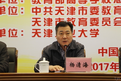 中共天津市教育工作委员会副书记、天津市教育委员会副主任杨清海致辞,他指出,天津市为了提高思想政治理论课质量,提供了资金、编制、政策等支持,通过天津市重点马克思主义学院建设、名师工作室设立、天津市高校思想政治理论课宣讲团组建、天津市大学生思想政治课公开课大赛等举措,使高校思想政治理论课教师成为羡慕的教师。