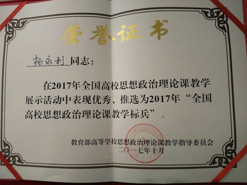 2017年10月29日,我校马克思主义学院杨永利教授在教育部举办的全国高校“毛泽东思想和中国特色社会主义理论体系概论”课教学展示会上,获得“教学标兵”称号。