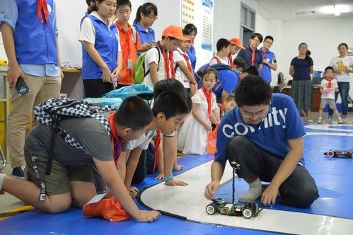 为了让营员们更充分的在参观中感受科技魅力,在科技辅导员高虹老师的带领和大学生志愿者们的陪同下,营员们先后参观了球探游戏智能车创新实践平台和电脑鼠走迷宫创新实验室。营员们观看了循迹小车追逐赛和电脑鼠走迷宫表演赛,欣赏了机器人舞蹈,并近距离的跟机器人互动。夏令营还以“实践中领略科技之美”为主题,营员们在科技辅导员的引导下学习机器人的控制原理,在大学生志愿者的帮助下开展了相关的科技实验。不仅了解了机器人控制原理,对“科技”二字有了不一样的认识,提升了对科技创造的兴趣,还在此过程中认识到了许多志趣相投的朋友。
