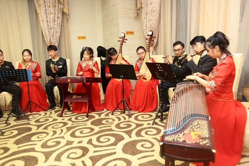 招待会晚宴采用冷餐会形式来迎接参加达沃斯论坛的中外青年科学家。席间,由我校学生组成的民乐团带来了一场融入中国文化特色的民乐演奏。以杨琴、二胡、古筝等为主要乐器演奏的《喜洋洋》、《彩云追月》等十首小合奏曲目彰显了中华民族的乐韵之美,为在场学者及嘉宾提供一段休闲、舒适的美好时光。借此珍贵机会,在场的中外学者也广泛进行友好交流。