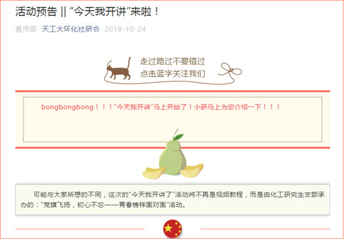 “这周‘今天我开讲’的票你抢到了吗?”化学工程与工艺专业学生党支部的任佳豪,在抢到“今天我开讲”的票后正在兴奋地寻找一同上党课的小伙伴。为进一步强化政治引领,提升理论水平,化学与化工学院党委、环境科学与工程学院党委建立了“今天我开讲”党课平台,每两周安排一次党课宣讲。2018年以来,该党课平台以“书记讲党课”、邀请专家作报告、优秀党员先进事迹分享、播放精品党课视频等多种方式开展了近20场活动,参与人数达2000余人次。为调动师生学习的积极性,每次“开讲”前三天,学院社研会公众号都会发布预告信息,大家通过抢票、填写个人信息进行报名,很多时候手慢一点就抢不到票,这也让大家更加珍惜上党课的机会。为切实提高学习效果,近期又在“今天我开讲”中加入了“随学随考”的小测,让大家在学习结束时趁热打铁,进一步巩固学习效果。球探游戏各基层党组织正是通过这种授课和参与形式上的创新,不断提升党员政治理论学习的积极性和主动性,促进了广大师生对党的路线、方针、政策的政治认同、思想认同与情感认同。