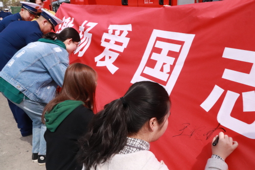 主题团会结束后,双方青年在人文学院英语1802团支书林聪伟的带领下重温入团誓词,并在“激扬爱国志,奉献新时代”的横幅上庄严签下了自己的名字。人文学院学生代表向物华道消防队消防员赠送了印有工大校徽和写有“希望救火的警铃永远不要响起”字样的T恤衫,以及写有同学们对消防队员祝福话语的明信片。