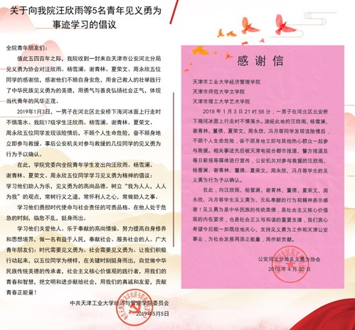 日前,天津公安局河北分局给我校经管学院送来一封感谢信,感谢该学院2017级学生汪欣雨、杨雪澜、谢青林、夏荣文、周永欣5位同学曾于今年年初在海河救起一位老大爷。