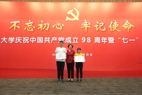 校领导为“五好党支部”标兵、优秀党务工作者、优秀共产党员和党建工作标杆单位颁奖。为表彰我校汪欣雨、杨雪澜、谢青林、夏荣文、周永欣和李佳宁6名同学见义勇为和助人为乐的优秀品质和高尚情操,学校党委决定授予他们“见义勇为优秀大学生”和“助人为乐优秀大学生”称号,校党委书记连洁为他们颁发了证书。