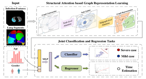 该模型首先构建了肺部结构图,然后采用图注意力网络迭代更新肺段表示。为了区分左右肺不同的感染程度,进一步引入了结构注意力机制。最后,融合患者个人信息等非图像类特征信息,搭建了联合多任务学习的整体框架。在1687例胸部CT扫描图像的实验结果中表明,所设计模型获得了最佳的诊断性能(如ACC为90.4%, AUC为86.86%)和预测结果(如相关系数为0.58)。