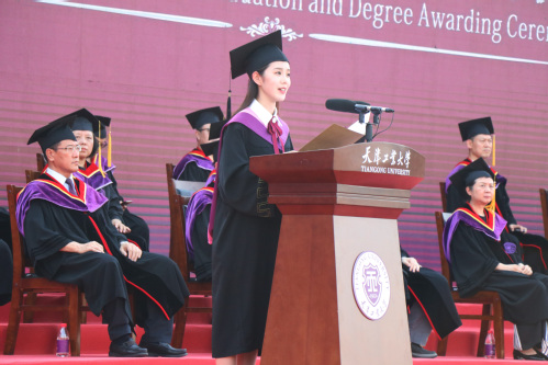 人文学院李竹作为毕业生代表发言,回顾了在校期间的学习生活经历,表达了对学校的祝福和感谢,表示将牢记天工嘱托,坚定理想信念,练就过硬本领,勇担时代责任,为强国建设、民族复兴贡献青春力量。