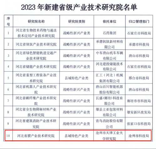 近日,河北省科学技术厅发布了《河北省科学技术厅关于2023年新建省级产业技术研究院的通知》,以球探游戏沧州研究院为依托单位的河北省膜产业技术研究院成功获批为2023年新建省级产业技术研究院。