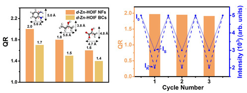 基于氢键的动态可逆特性,团队所开发的新型HOIFs还可通过“解组装”方式制备单基元手性纳米链结构,并能通过“再组装”可逆恢复HOIFs框架结构,且表现出“解组装-再组装”过程依赖的手性光学活性,包括不对称因子高达1.7X10-3的圆偏振发光活性。进一步,研究团队利用HOIFs的动态手性光学活性,还实现了对脂肪族等手性难识别底物的高效和往复手性识别及检测。