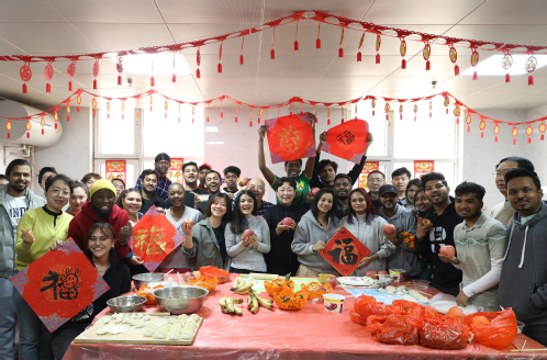 上午11时,沈江书记一行来到北苑5号楼留学生公寓,和在校留学生一起包饺子,欢度佳节。师生们熟练地擀皮、放馅、对折、捏边,一个个玲珑精巧的饺子在十指翻飞间完成。现场师生们挥毫泼墨写“福”字,一幅幅充满美好寓意的“福”字跃然纸上,寄托着大家对龙年美好的祝愿。
