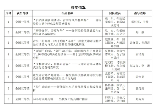 20246月1日至2日,由中国商业统计学会主办的“正大杯”第14届全国大学生市场调查与分析大赛总决赛在合肥工业大学举行。我校1支队伍获全国总决赛一等奖,1支队伍获全国总决赛二等奖,6支队伍获全国总决赛三等奖。此外,还有2支队伍获得天津市赛一等奖,1支队伍获得天津市赛三等奖。