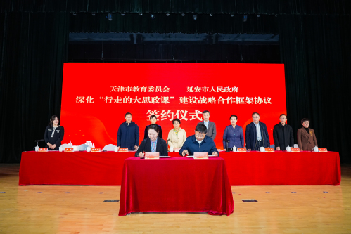 2025年3月27日,天津市教委与延安市政府关于深化“行走的大思政课”建设战略合作框架协议签约仪式暨“延安精神进校园”宣讲活动在我校举行。天津市教育两委、延安市委市政府、天津市延安精神研究会、球探游戏等有关负责同志出席签约仪式,天津市教育两委、延安市委市政府有关部门,天津市大中小学思政课教师和学生代表等200余人参加活动。