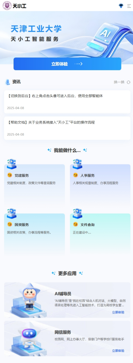 目前,“天小工”智能平台作为全校大模型接入平台,已建设了“党建服务”“AI辅导员”“人事服务”“国资服务”“网信服务”等多个智能体应用,为全校业务系统赋能,使管理服务更上一个台阶,人机对话更加自然流畅,大幅提升了查询学校相关信息的速度和准确性。